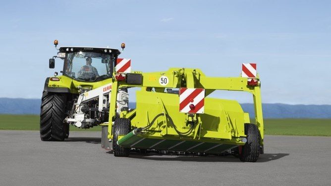 Tapis convoyeur rapproché de la faucheuse : regroupeur d'andains sur la DISCO 3200 TC AUTOSWATHER. En dépit de leurs dimensions importantes, les faucheuses traînées DISCO sont très maniables.