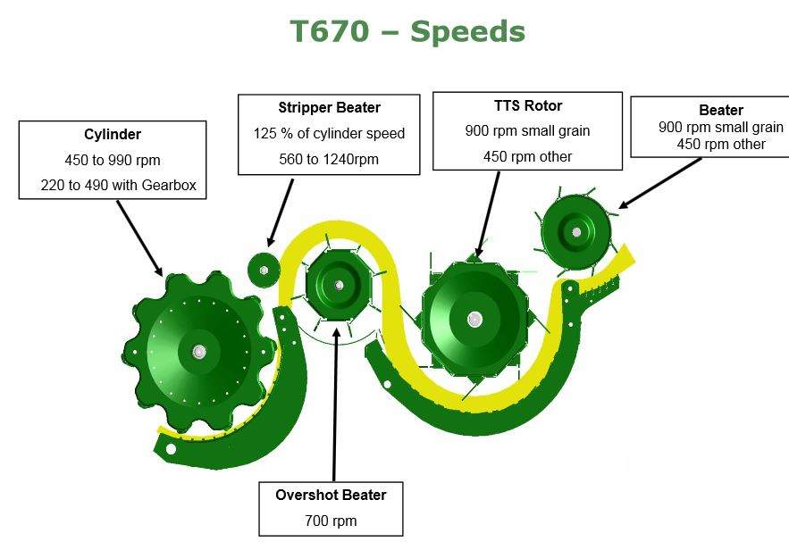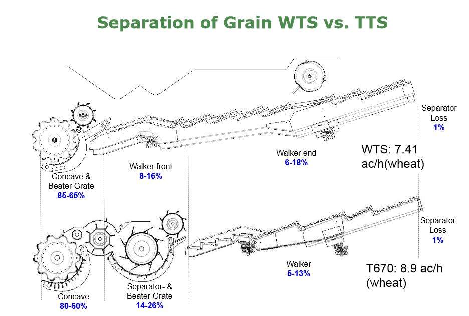Par rapport aux John Deere WTS qu'elles remplacent en partie avec la série W, les organes de battage ont été revus sur les moissonneuses de la série T. A l'exception du batteur unique, identique à celui de la Série WTS (660 mm de diamètre et lourd pour une forte inertie), les éléments qui suivent sont différents. Le batteur est en effet suivi d'un tambour inversé pour conduire la matière du batteur vers le séparateur non par dessous mais par-dessus afin d'éliminer les angles vifs. Après ce tambour, on trouve un séparateur tangentiel de 660 mm de diamètre (et une longueur de 1640 mm) avec un contre-séparateur doté d'une capacité de battage puis un tire-paille conduisant la matière vers les secoueurs. Ce tire-paille possède également un élément de séparation.