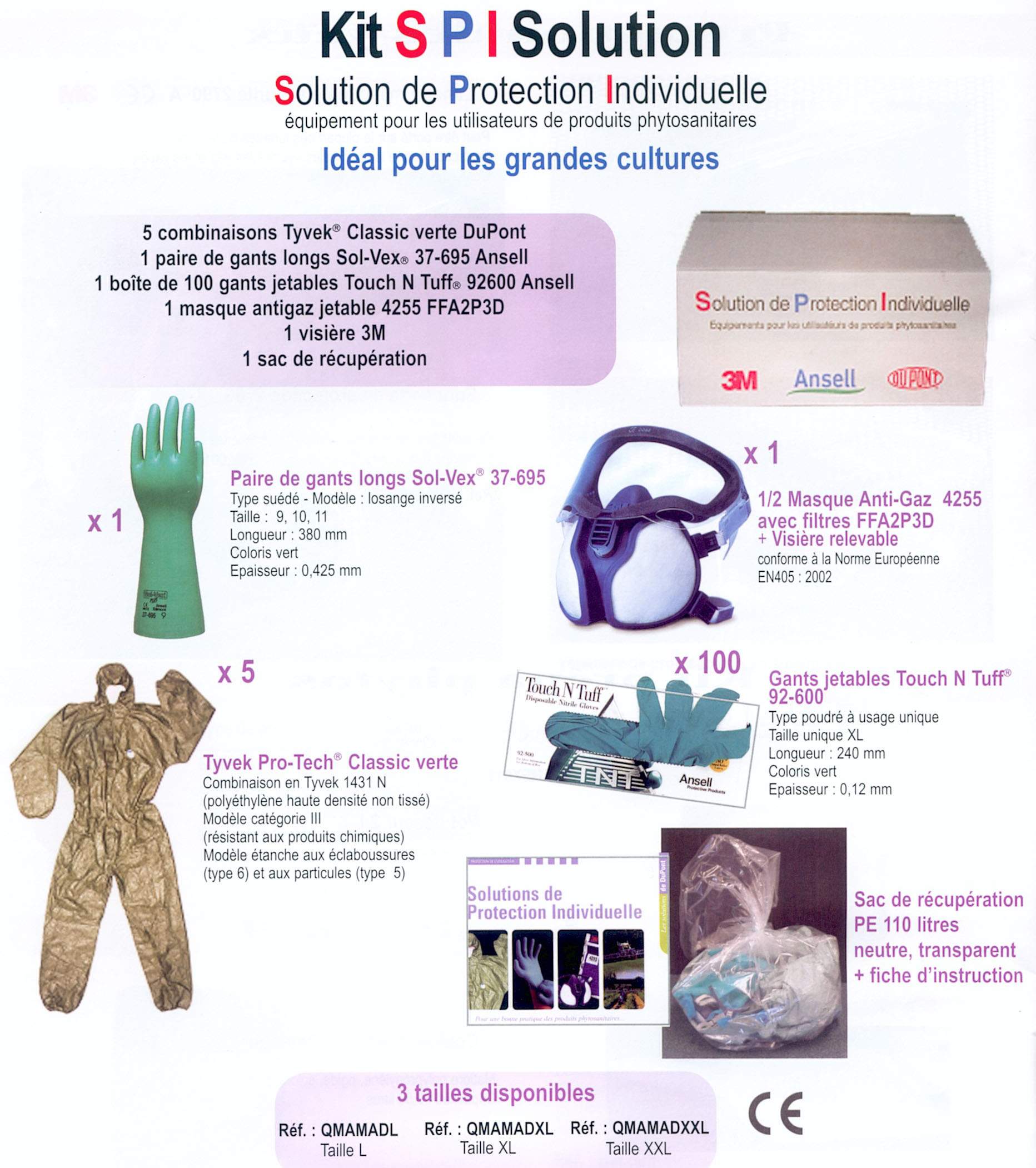 Cette Solution de Protection Individuelle (SPI) est recommandée pour un niveau d’utilisation faible (par exemple 40 heures ou 5 traitements). Pour une utilisation modérée ou intensive (par exemple :80 heures ou 10 traitements ou 120 heures ou 15 traitements), un nombre de recharges(1 ou 2) adapté sera proposé comprenant : 5 combinaisons Tyvek Pro-Tech(1) Classic verte, 1 paire de gants longs Sol-Vex (2) 37695, un ½ masque avec cartouches A2P3.