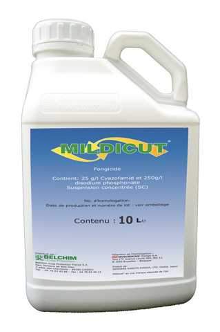 Mildicut est la combinaison unique de 2 matières actives : 25 g/l de cyazofamide et 250 g/l de di sodium phosphonate.