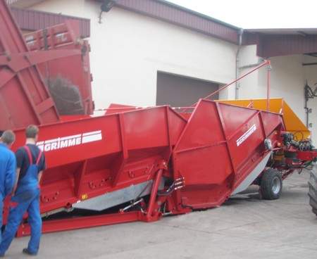 Grimme a développé en 2010 une nouvelle trémie de réception Tandem TH de grand volume afin de réduire le délai d’attente des véhicules. La trémie Grimme TH est directement couplée à la trémie Grimme RH 24-60 ou au Grimme Combi RH 24-60 et récupère les pommes de terre du véhicule.