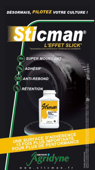 - Mouillabilité: Sticman serait le seul super mouillant du marché des adjuvants. L’étalement et donc la surface de contact de la gouttelette est de multiplié par 15. La bouillie est mieux répartie, plus étalée et la couverture est optimale. D’après Agridyne, Sticman permettrait de traiter à des volumes réduits (120 litres/ha et moins).