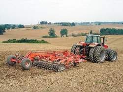 La version trainée compte 3 largeurs de travail de 6, 7 et 8 m.Le contrôle de la profondeur de travail se fait par des roues de jauge à l'avant et le rouleau de réappui arrière.