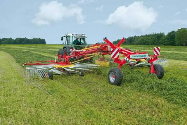 Les Pöttinger Top 852 C s-line et Top 972 C s-line sont des andaineurs doubles à dépose centrale d’une largeur 7,75 m à 8,55 m pour le 852 et de 9 m à 9.80 m pour le 972, formant des andains de 1.20 à 2.30 m de large.