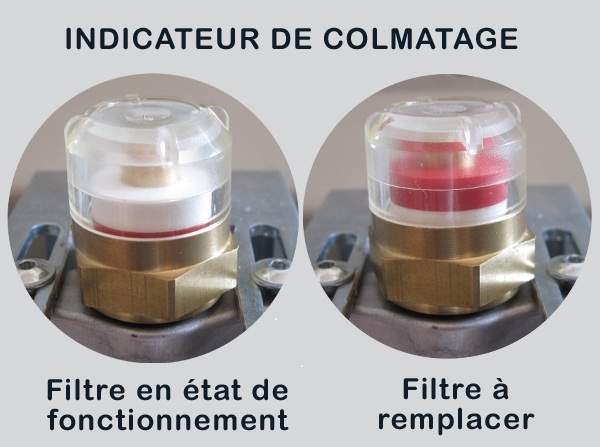 L’indicateur de colmatage passe au rouge lorsqu’il a détecté une perte de débit de la pompe (environ 2/3), avertissant ainsi l’utilisateur qu’il va être temps de remplacer le filtre, lui évitant ainsi l’immobilisation de ses engins.