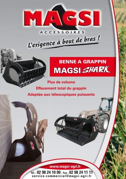 La benne à grappin MAGSI Shark serait adaptée aux chargeurs télescopiques puissants. Elle autoriserait plus de volume. Le grappin s'efface complètement pour pouvoir approcher au plus près des murs.