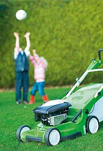 Vicking a installé un rouleau de jardin qui remplace les deux roues sur l'axe arrière de cette tondeuse de la série 6. Lors de la tonte, le rouleau de jardin aplatit les brins d'herbe dans le sens de la tonte.