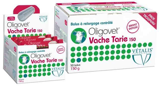 Oligovet Vache Tarie 150 est présenté en boites de 20 boli de 150 g ou en pack troupeau de 50 unités. Disponible chez les vétérinaires.
