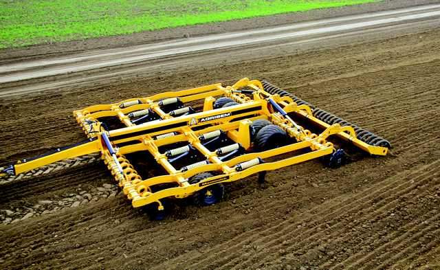 - Les rangées de disques reprennent les éléments du Disc-O-Mulch: le ressort queue de cochon de 35 mm associé à un disque crénelé de 560 mm ou 610 mm. Le ressort travaille spire contre spire et génèrerait ainsi un effet percussion qui diminuerait la consommation de carburant et améliorerait la capacité de pénétration en sol dur. Les moyeux sont étanches, et ne nécessitent aucun graissage.