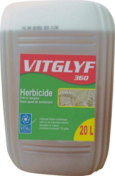 "Vitglyf 360" de Vital Concept est un désherbant total qui se compose de 360 g/litre de glyphosate + 179 g/litre de surfactant.