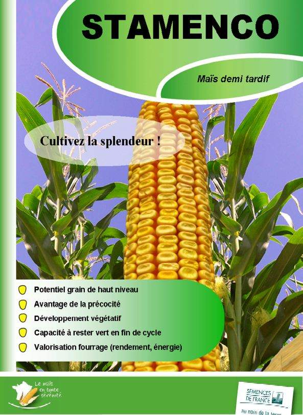 D’après Semences de France, Stamenco se distingue particulièrement par une très bonne vigueur au départ qui sécurise l'implantation de la culture, une surface foliaire très développée avec une excellente capacité à rester vert en fin de cycle, ce qui permet d'optimiser les niveaux de rendements.