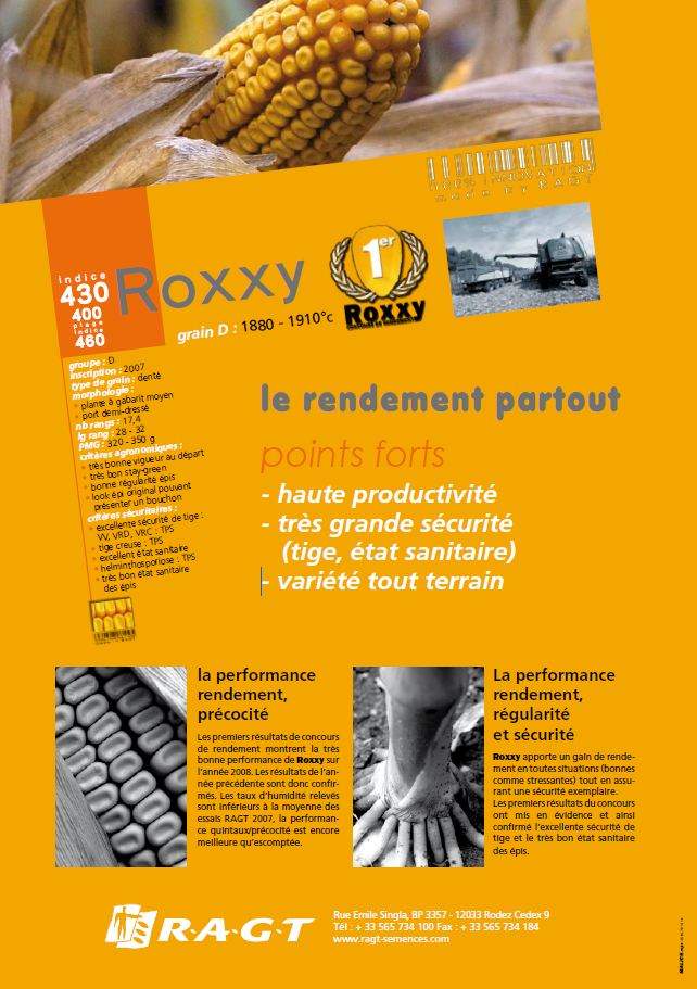 D’après RAGT Semences, Roxxy apporte un gain de rendement en toutes situations (bonnes comme stressantes) tout en assurant une sécurité exemplaire.