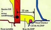 - Ecartement entre les pneus : à la demande jusqu'à 20 cm entre les pneus montés. Le choix est définitif car l'écartement du jumelage correspond aux supports de l'étoile. C'est à dire, soit un support de 50 mm, de 100 mm ou de 140 mm ou même plus selon l'entre-pneu souhaité.