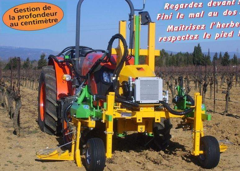 L'outil interceps des Ets Ferrand repose sur un chassis de base, le HDI 3000. Ce chassis comporte des supports interceps extensibles hydrauliques et 2 roues de régulation réglables par manivelle.