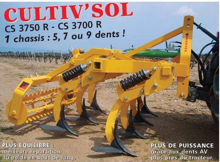 Les différents modèles de Cultiv'sol des Ets Ferrand, le CS 3750R et le CS 3700 R, reposent sur un seul chassis. Ce chassis peut recevoir 5,7 ou 9 dents. A l'arrière, on trouve un rouleau 8 barres crantées avec réglage de la profondeur par vérin hydraulique.