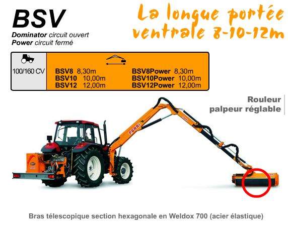 Les faucheuses-débrousailleuses Ferri BSV8, BSV10, BSV12 et BSV8Power, BSV10Power et BSV12Power conviennent pour des tracteurs de 100 à 160 ch.Ils sont équipés d'un bras télescopique à section hexagonale en Weldox (acier élastique).