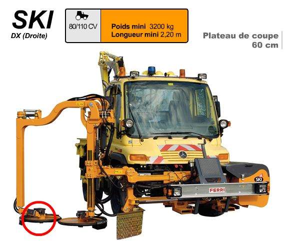 La faucheuse sous glissière Ferri SKI DX (droite) nécessite une puissance de 80 à 100 ch. Son poids minimal est de 3200 kg. Sa longueur minimal est de 2,20 m. Le plateau de coupe fait 60 cm.