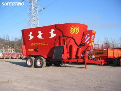 La série de mélangeuses Supertino "Star-Mix Twin" (versions à trois vis sans fin) est dotée d'un balancier et d'un essieu arrière suiveur.