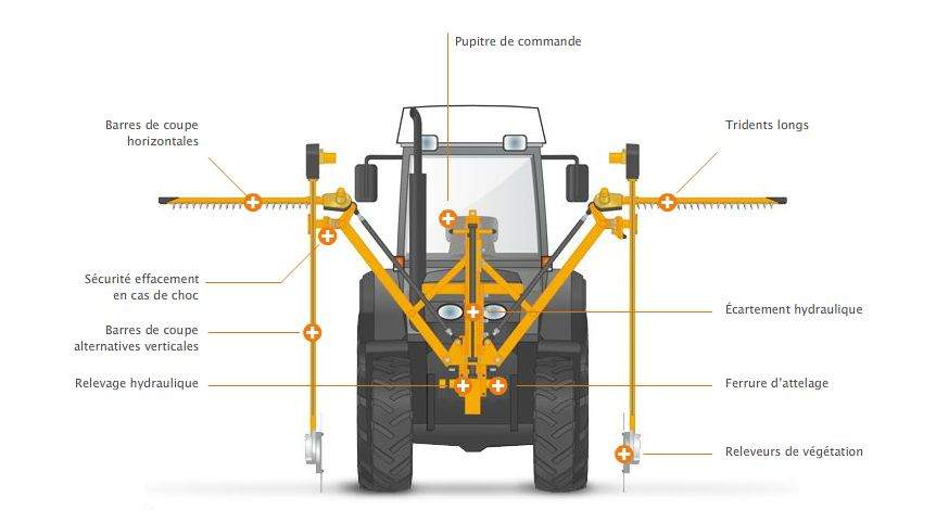 Les pointes des dents sont équipées d’arrêtoirs à leurs extrémités pour éviter que la végétation ne s’échappe avant d’être coupée. Sur chaque barre, les deux lames sont mobiles et la vitesse des mouvements est réglable, pour optimiser la vitesse d’avancement.