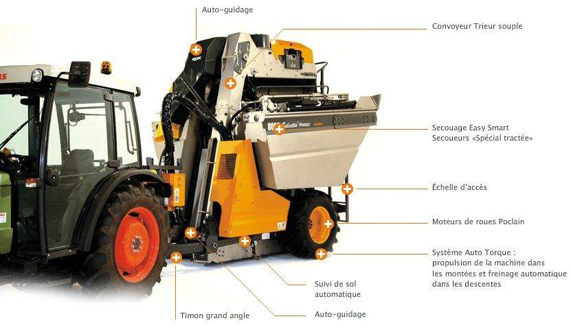 Par ailleurs, le système de convoyeur-trieur souple faciliterait la circulation de la vendange, pour une récolte sans feuille ni perte de jus grâce au tri de la vendange qui intervient dès le décrochage des grappes.
