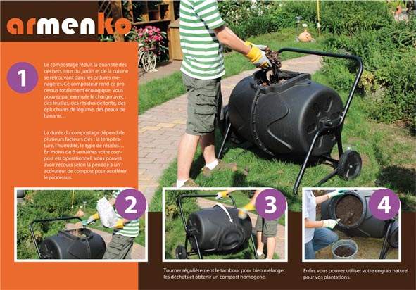- Pour optimiser la montée en température, le bac composteur rotatif d'Armenko est en plastique noir et non pas en métal.