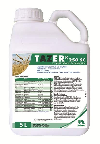 "Tazer 250" un fongicide polyvalent à base d’azoxystrobine. Présenté sous forme de suspension concentrée, « Tazer 250 » développe une action translaminaire et systémique. Il agit à la fois sur la germination, la croissance du mycélium et la sporulation en bloquant la respiration des champignons au niveau des mitochondries.