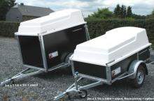 Remorque vacances avec capot polyester à fermeture à clef. Il est possible d'enlever le capot de cette remorque bagagère afin de l'utiliser comme une remorque classique simple essieu.