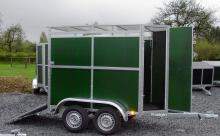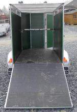 Remorque Poney avec pont arrière pour charger. Porte avant latérale afin d'accéder à l'intérieur de la remorque sans devoir abaisser le pont. Aérations sur les côtés supérieurs.