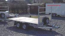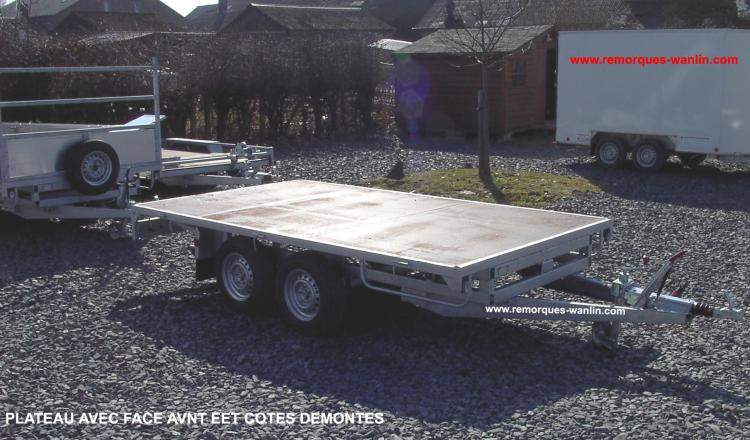 Remorque Plateau Aluminium roues sous la remorque, 2 essieux avec freins, munie de ridelles aluminium amovibles. Il est possible de charger cette remorque de tous les cotés ou d'en faire un Plateau Nu.