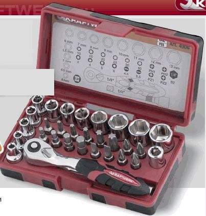 Kraftwerk commercialise une boite de douilles et embouts 1/4'' bi-matière avec cliquet micro de 60 dents à éjection rapide des douilles.