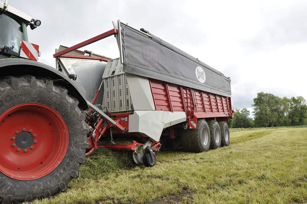 Avec une remorque autochargeuse, le début du déchargement est le moment le plus critique car il implique une mise en mouvement de toute la charge. Selon les modèles, la paroi frontale prend en charge 10 à 15% du fourrage. La pression au sol est donc diminuée, ce qui signifie que la pression exercée sur le fond mouvant est inférieure. Dès que le fond mouvant s’enclenche, la paroi frontale – avec le fourrage – s’incline vers l’arrière et, pousse la totalité du fourrage dans la remorque.