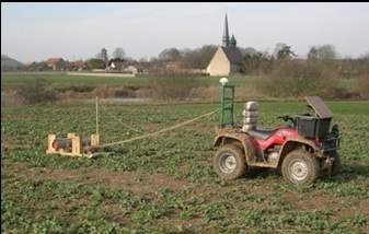 - Acquisition des données par l’utilisation de la technologie Geonics EM-38 (fréquence des données : 3500 mesures/hectare), niveau d’investigation (profondeur d’enracinement (plus de 135 cm), mesure quand le sol est ré-humecté en profondeur (en général de novembre à mars), positionnement des mesures par GPS, traitement des données et établissement des cartes de conductivité, localisation sur un logiciel SIG puis sur les parcelles des profils culturaux, établissement des cartes de potentiel de sol,