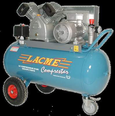 Le « Comprestar 27 V 100 T » de Lacmé est un compresseur d’air à courroie triphasé. Il débite 27 m³/h et a une cuve de 100 litres.