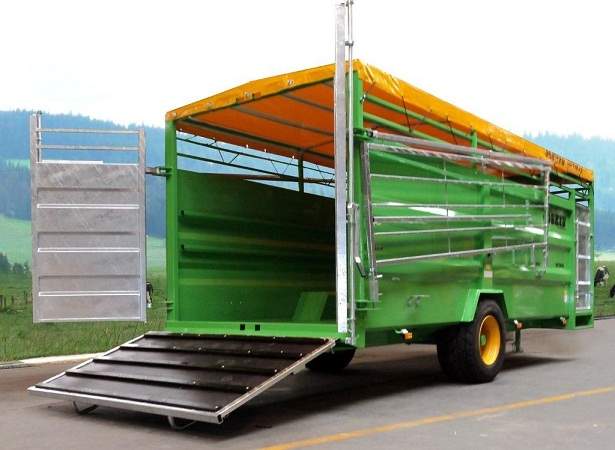 - le chargement / déchargement s'effectue via une rampe en bois imputrescible munie de lattes d'arrêt et insérée dans un cadre-renfort galvanisé; le relevage de la rampe s'effectue sans effort grâce au piston à ressort de rappel;
