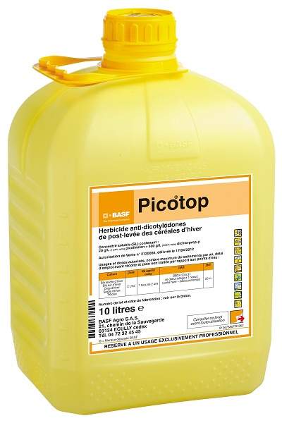 BASF Agro a obtenu l'homologation de Picotop le 2 mai 2012, pour le désherbage des blés dur et blé tendre d'hiver, de l'orge d'hiver, du seigle d'hiver et du triticale. Ce nouvel herbicide à très large spectre, composé de picolinafène et de dichlorprop-p, associe deux modes d'action "originaux" (groupe O et F1), permettant de préserver l'efficacité des désherbages aujourd'hui et demain, en diversifiant les modes d'action.