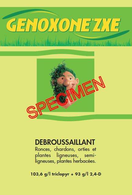 Le « Genoxone ZXE » de la firme Agriphar est un herbicide débroussaillant composé de deux matières actives: le 2,4-D (famille des aryloxyacides) et le triclopyr (famille des acides picoliniques). Ces 2 matières sont foliaires et systémiques. Leur mode d’action est de type auxinique. L’association du triclopyr au 2,4-D confère au Genoxone ZXE une grande polyvalence d’action sur les plantes ligneuses et semiligneuses. Sélectif des graminées, Genoxone ZXE préserve un couvert végétal utile. Genoxone ZXE peut également être utilisé pour la dévitalisation des souches.