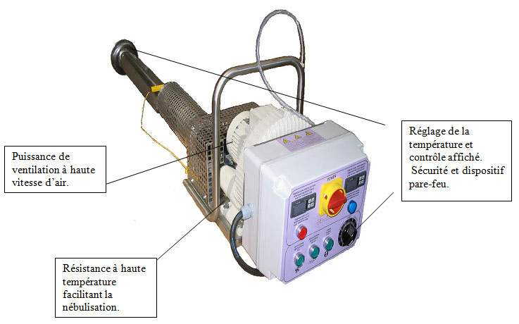 - Thermostats avec alarmes pour contrôle de la température de nébulisation (environ 600°C) et de la température de sortie (170-240°C) selon les produits,
