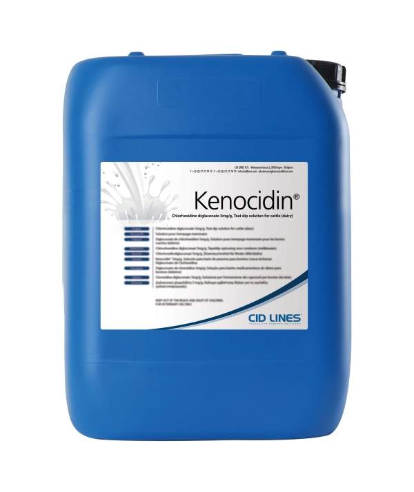 Kenocidin est un produit de trempage à base de chlorhexidine et de Menthae arvensis. Il est enregistré comme médicament dans 23 pays européens, avec deux indications: désinfection des trayons dans une stratégie de prévention des mammites et pour le maintien d'une bonne condition de la peau et de l'extrémité des trayons.
