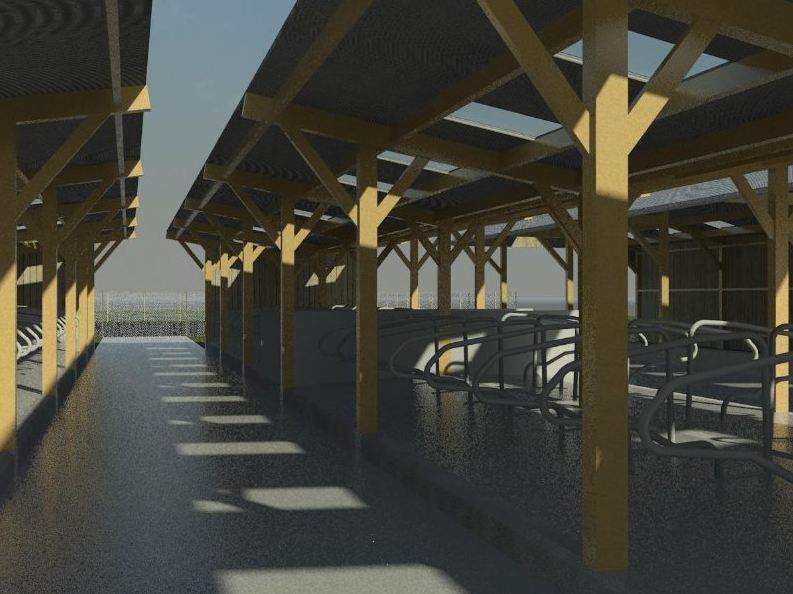 Si le couloir de circulation entre les deux rangs de logettes est semi-couvert, l’aire d’exercice est largement découverte. Un jeu de barrières galva oriente le parcours des animaux, en particulier au moment de la traite ou des soins.