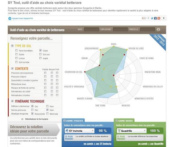 Pour faire le bon choix, Syngenta a crée SY Tool. Il s'agit d'un outil d’aide au choix variétal de betteraves pour identifier rapidement la variété la plus adaptée à votre contexte, type de sol et itinéraire technique.