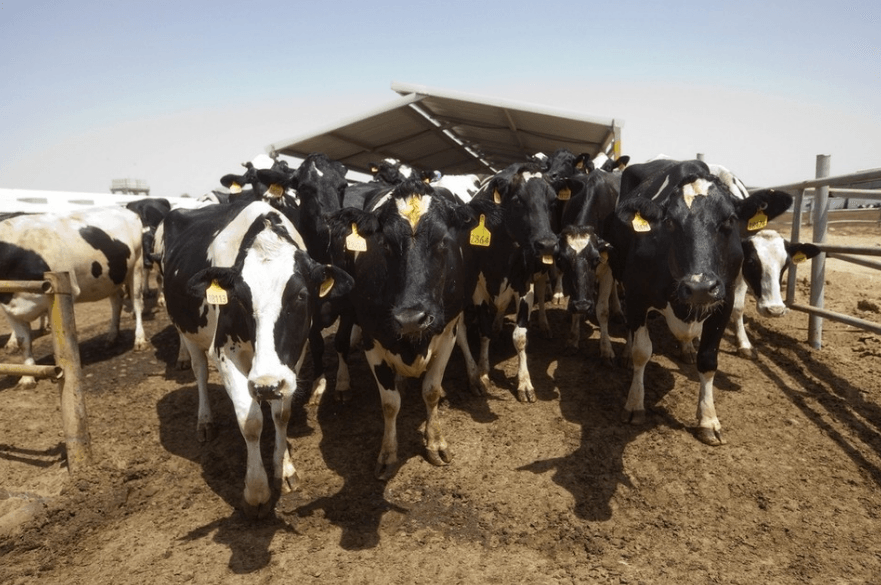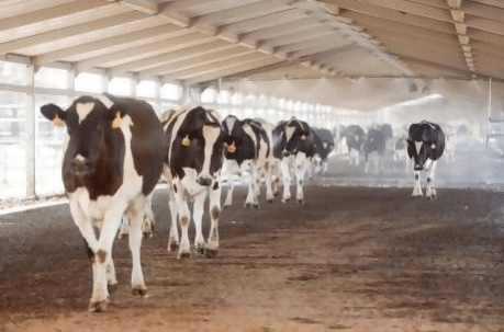 En été la production de lait diminue de 40 pour cent à cause de la chaleur en effet lorsqu'il fait près de 50°C à l'extérieur du bâtiment difficile de garde la température corporelle des vaches à 38°C.