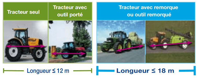 La longueur autorisée est inférieure à 12 mètres si tracteur seul ou si tracteur avec outil porté. La longueur autorisée passe à 18 mètres en cas d’outil remorqué.