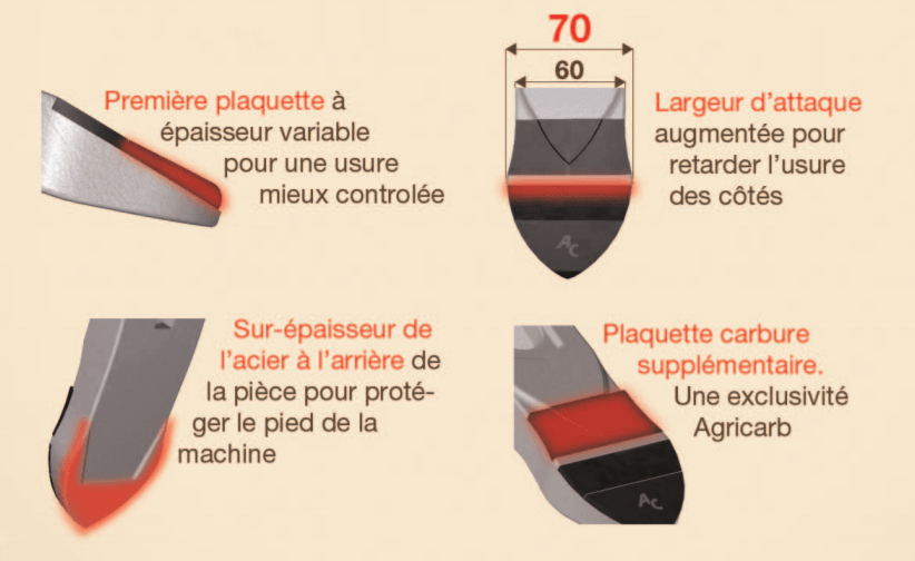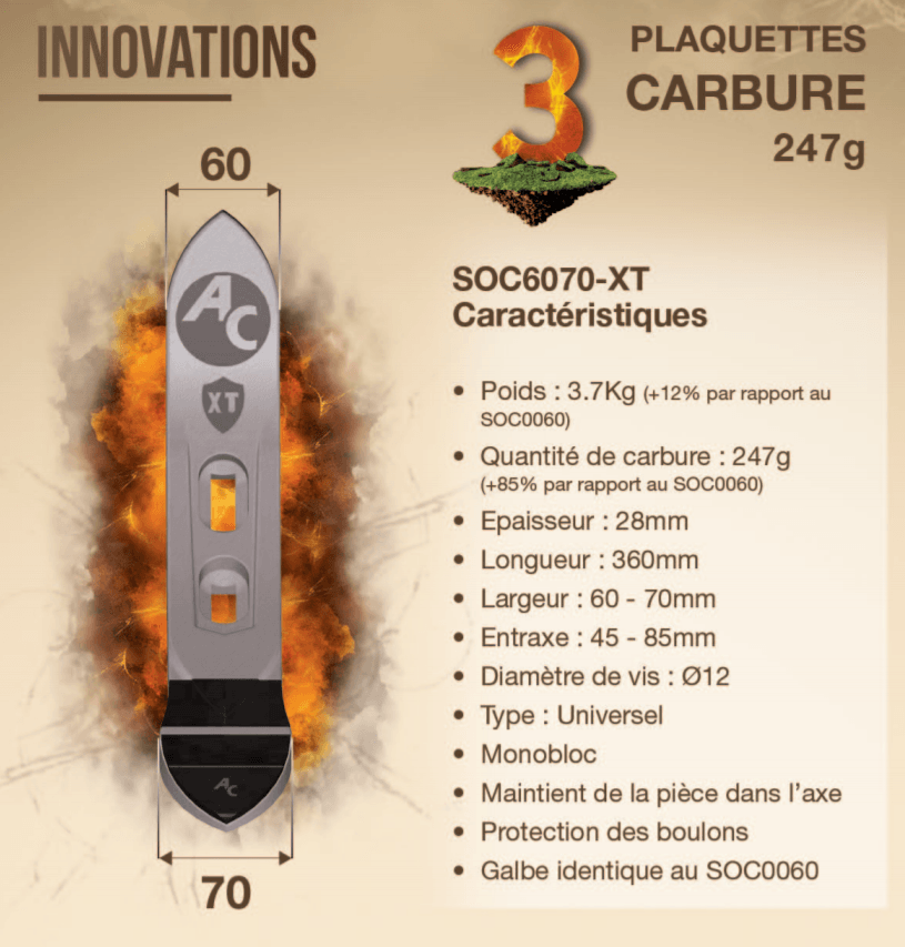 Les évolutions technologiques et techniques développées par Agricarb permettent aujourd’hui de proposer une nouvelle génération de pièces d’usure au carbure de tungstène. Le concept XT présente la gamme la plus aboutie d’Agricarb. Le SOC6070-XT n’a pas d’équivalent sur le marché de par sa durée de vie nettement supérieure à une pièce carbure classique.