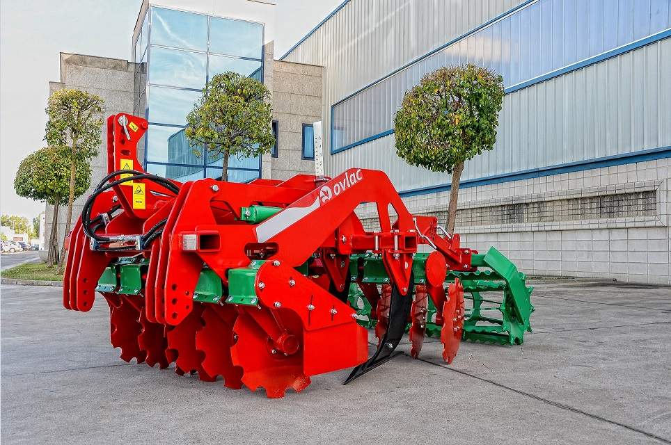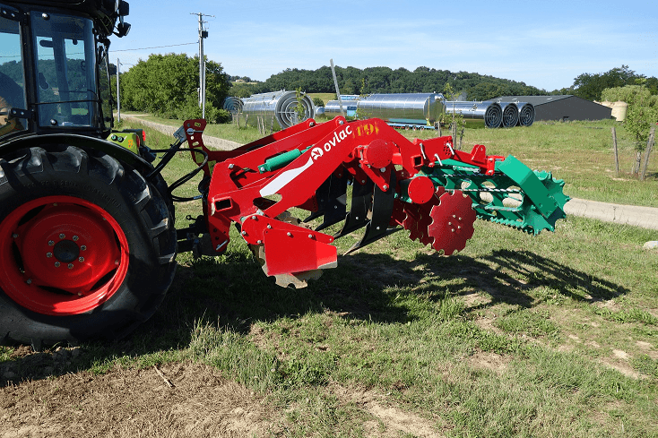Outil porté, le RepTill se compose d’avant en arrière d’une rangée de disques crénelés indépendants de 510 mm de diamètre, de 4 dents d’ameublissement courbes de 600 mm de dégagement, d’une nouvelle rangée de disques, et se termine par un rouleau égalisateur de fort diamètre. Son originalité repose sur le parallélogramme qui relie les dents courbes au châssis. « En le réglant depuis la cabine, explique Jorge Calvo, le principal dirigeant d’Ovlac, on peut faire varier en continu la profondeur de travail des dents, jusqu’à les escamoter au travail, là où ces dents ne sont plus utiles ». C’est le cas pour les passages d’entretien de l’interrang, qui peuvent dès lors s’effectuer à vitesse d’avancement soutenue.
