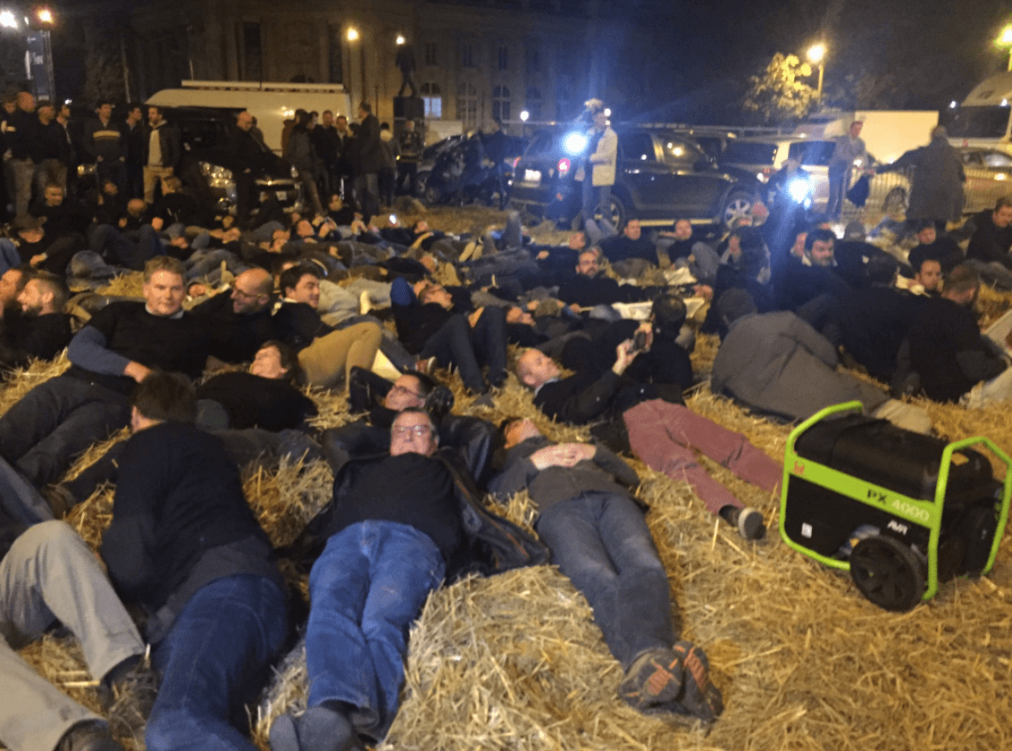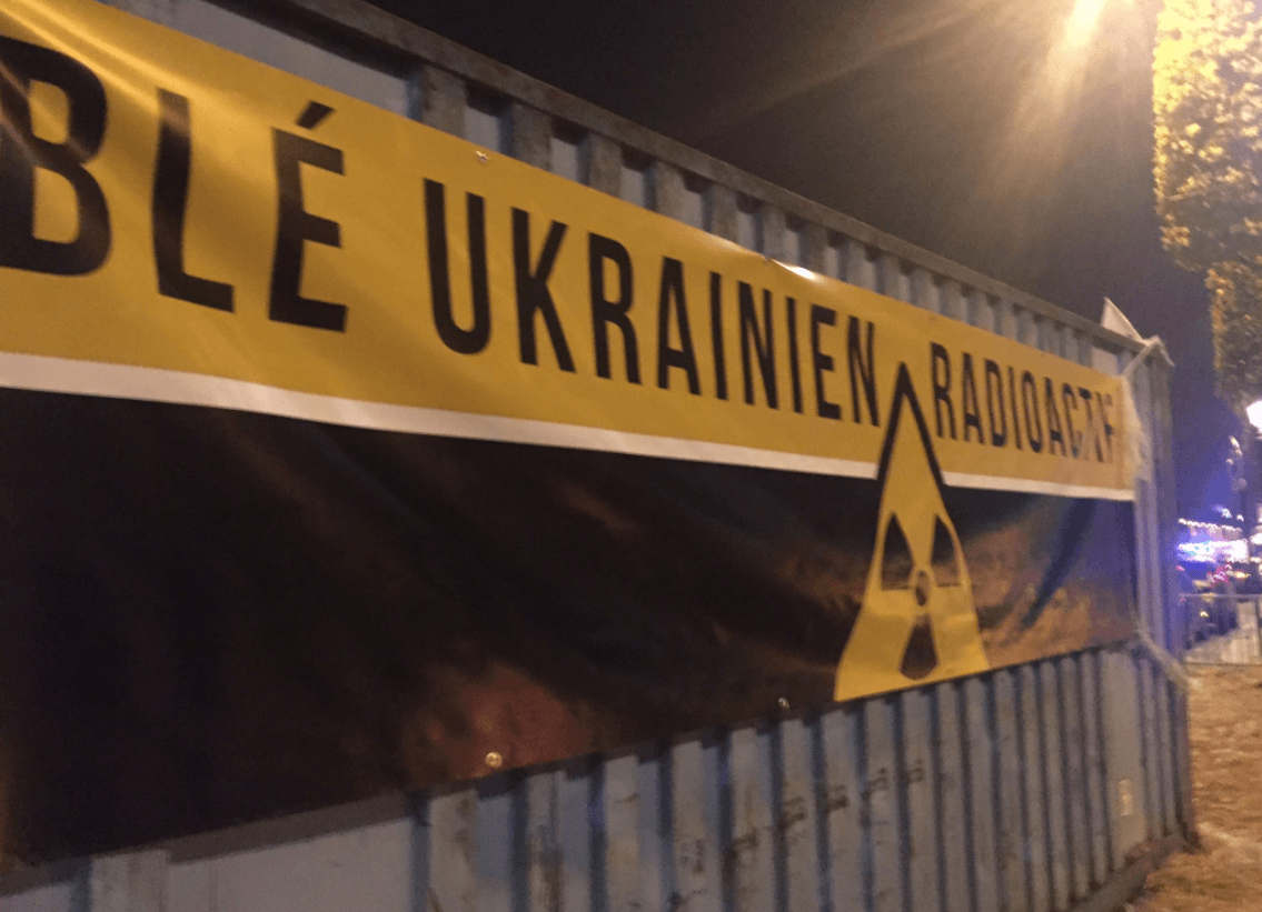 Les agriculteurs, rassemblés à l'angle des Champs-Elysées et de l'avenue de Marigny, ont déversé sur la chaussée de la paille, sur laquelle, vêtus de noir, ils se sont allongés. "Macron tue les agriculteurs", pouvait-on lire sur une pancarte "soja argentin OGM" sur une autre et "blé ukrainien radioactif" sur une dernière.