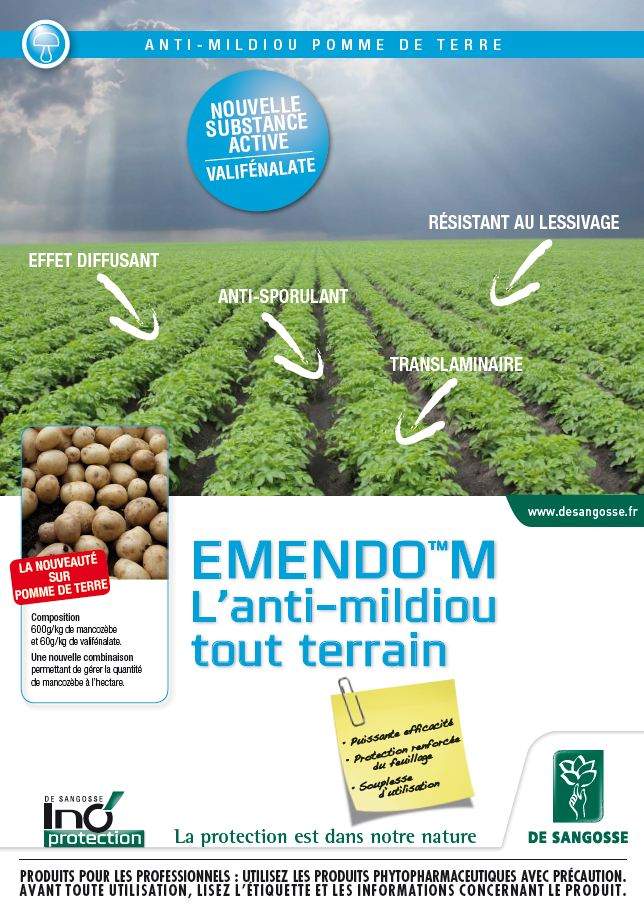 Issu de la recherche Isagro, le fongicide Emendo M de la firme De Sangosse se compose de 60 g/kg de valifénalate et de 600 g/kg de mancozèbe. Il est préconisé à 2 kg/ha. Le valifénalate, nouvelle substance active en pomme de terre, fait partie de la famille des CAA (Carboxylic Acid Amines) : il neutralise la synthèse des phospholipides entrant dans la constitution des parois cellulaires. Il agit à la fois sur la production de spores et sur le mycélium du champignon. Le valifénalate est doté de propriétés translaminaires, diffusantes et anti-sporulantes. 3 applications au maximum sont autorisées durant la culture.