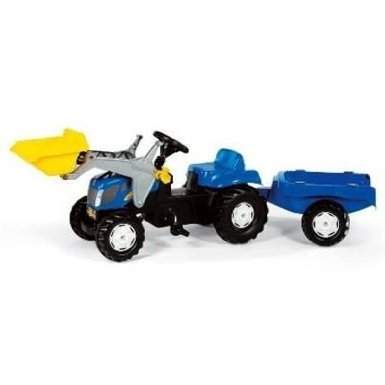 Le "Rolly Kid" de la firme "Rolly Toys" est un tracteur à pédales New Holland T7040 avec chargeur frontal et remorque.