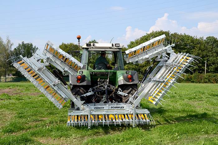 La herse Scariflex est un aérateurs de prairie. Elle est disponible à des largeurs de travail de 4,80 m. à 9,60 m.