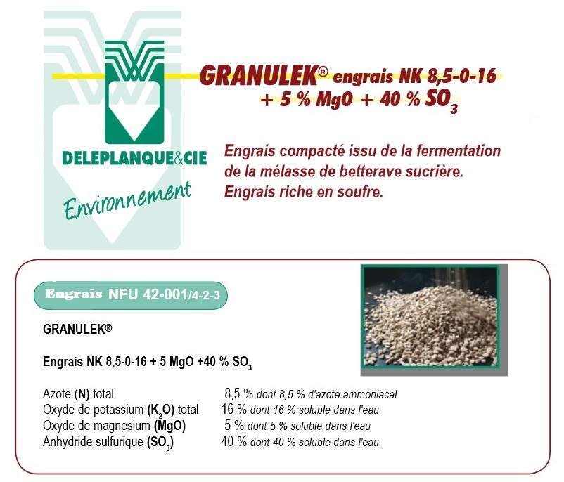 Granulek est un bi-sulfate d'ammonium et de potassium très soluble dans l'eau. Il est commercialisé par Deleplanque, basé à Maisons-Laffitte.
