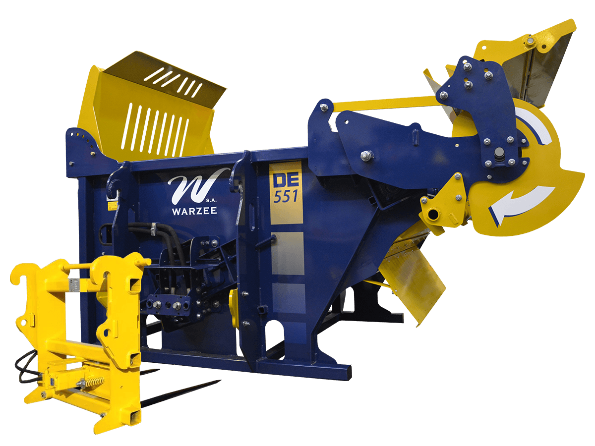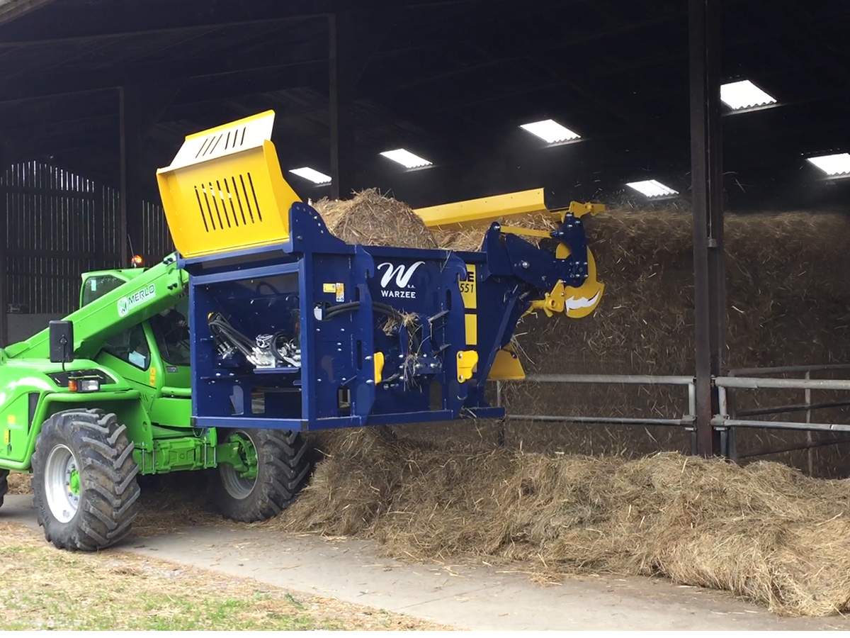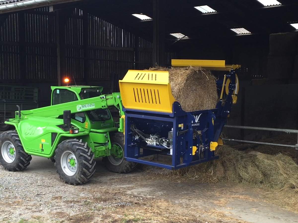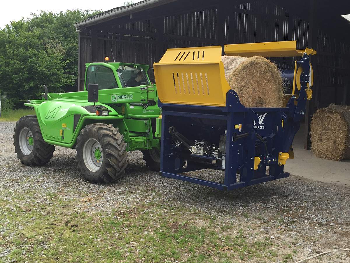 La dérouleuse-pailleuse Warzée DE551 permet de distribuer des balles rondes de foin et d'enrubanné. Elle permet également de pailler des balles rondes et cubiques, projettant la paille jusqu'à 15 mètres.